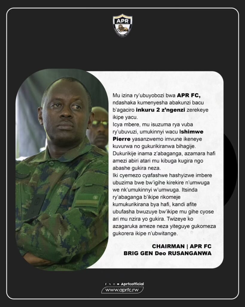 Mu butumwa bwashyizwe ahagaragara n’ubuyobozi bwa APR FC, Brig Gen Deo Rusanganwa yasobanuye ko Ishimwe Pierre atigeze ashyirwa ku ruhande kubera imyitwarire mibi nk’uko byagiye bivugwa.