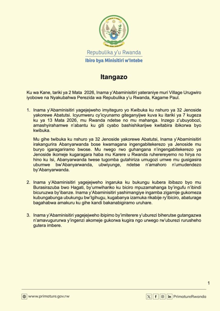 Inama y’Abaminisitiri yagejejweho imyiteguro yo Kwibuka ku nshuro ya 32 Jenoside yakorewe Abatutsi. Icyumweru cy’icyunamo giteganyijwe kuva ku itariki ya 7 kugeza ku ya 13 Mata 2026, mu Rwanda ndetse no mu mahanga.