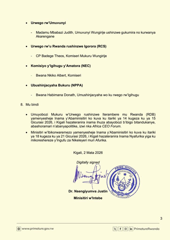 Ikigo cy’u Rwanda gishinzwe guteza imbere ubufatanye (RCI)Bwana Niwenshuti Richard, Umuyobozi Mukuru Madamu Tubane Chance, Umuyobozi Mukuru ushinzwe ibikorwaUrwego Rushinzwe Iterambere mu Rwanda (RDB)Bwana Nsengiyumva Joseph Cedrick, Chief Corporate Affairs OfficerBwana Kayibanda Richard, Chief Licensing OfficerUrwego rw’UmuvunyiMadamu Mbabazi Judith, Umuvunyi Wungirije ushinzwe gukumira no kurwanya AkarenganeUrwego rw’u Rwanda rushinzwe Igorora (RCS)CP Badege Theos, Komiseri Mukuru WungirijeKomisiyo y’lgihugu y’Amatora (NEC)Bwana Nkiko Albert, KomiseriUbushinjacyaha Bukuru (NPPA)Bwana Habimana Donath, Umushinjacyaha wo ku rwego rw’lgihugu8