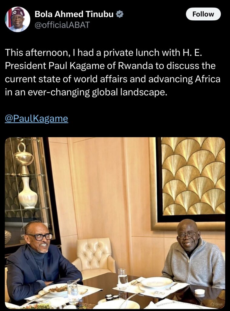 Ku wa 04 Mutarama 2026, Perezida Bola Tinubu wa Nigeria, yatangarije kuri X ko yasangiye ibya saa sita na Perezida KAGAME w’u Rwanda i Paris mu Bufaransa.