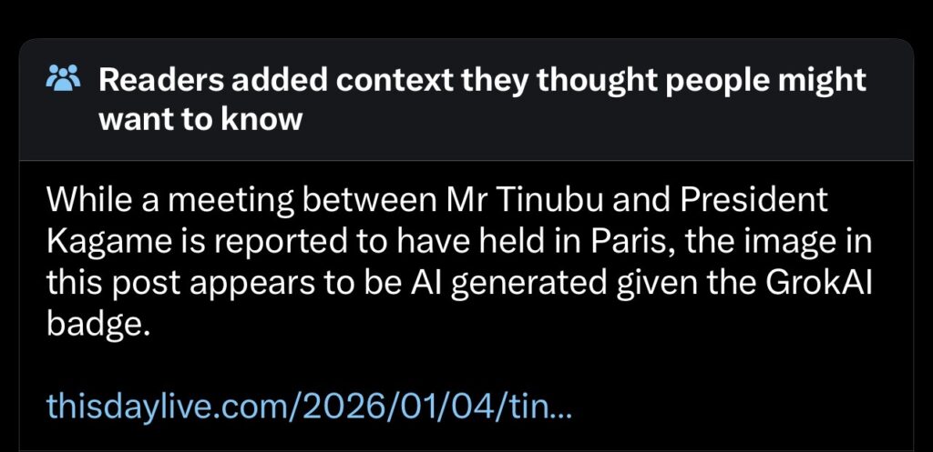 Aba baturage bakoresha imbuga nkoranyambaga, bavuga ko ifoto yatambukijwe na Perezidansi ya Nigeria yakozwe na AI kuko ifite ikirango [Logo] cya Grok Porogaramu ikoresha ubwenge buhangano.